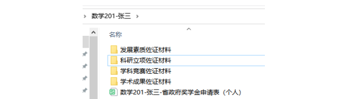 3.申请的同学请填写 附件4 嫩模 省政府奖学金申请表(个人) ,与相关佐证材料整理打包,文件夹命名为“班级-姓名”,佐证材料汇总方式如图所示: